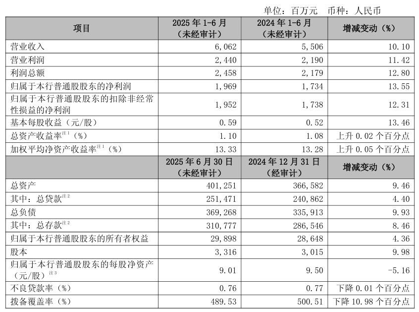 2025年上半年,本行坚持聚焦主责主业,资产负债双向发力,负债成本持续下降,客户生态不断扩容,创新业务多点开花,省内版图再启新篇,营收利润继续保持“两位数”增长,资产质量处于行业较好水平。